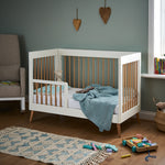 - Adjustable three-position base height cot bed that can transform into a toddler bed