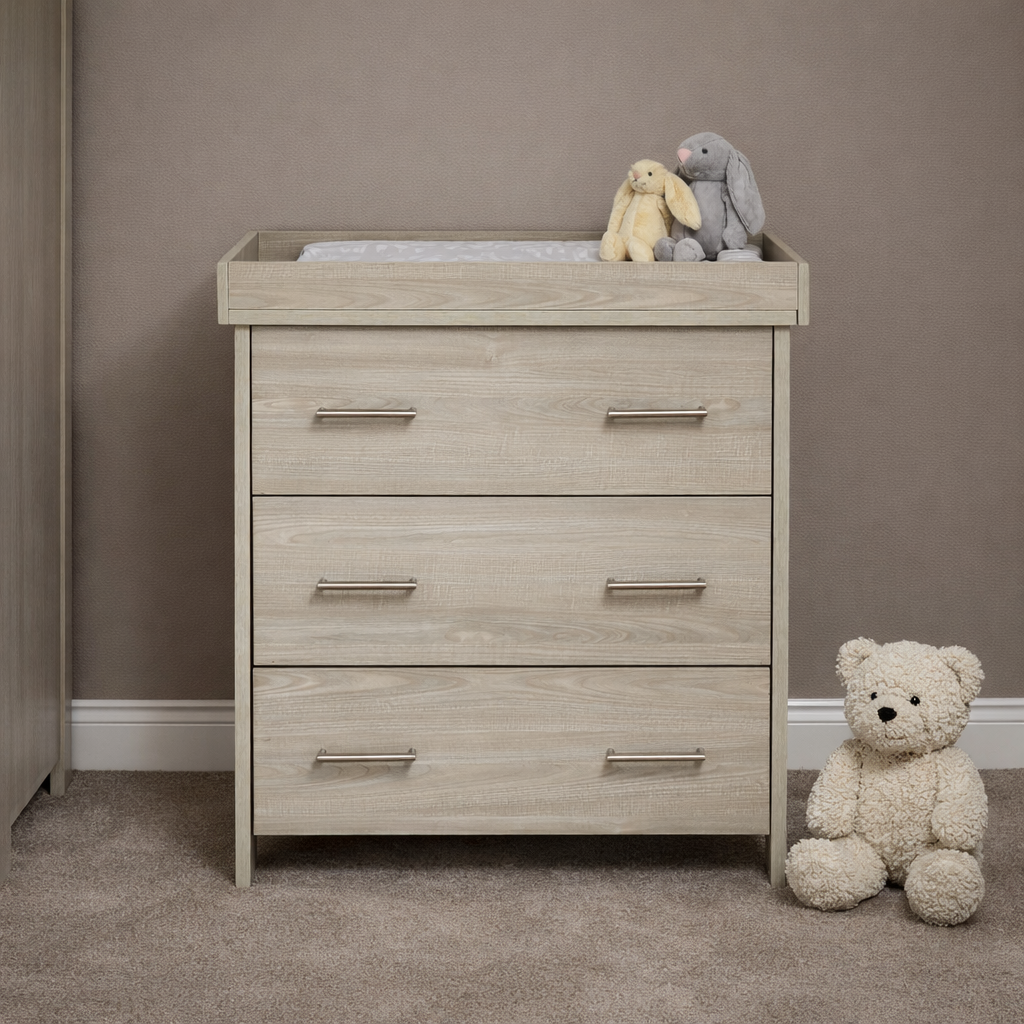 The Nika changing unit is a piece of furniture that can be used for years to come. Three large 32L capacity drawers offer plenty of space for changing essentials, toys and your little one’s precious possessions. All three drawers feature two brushed metal handles and glide on smooth runners allowing you to easily open them with either hand.